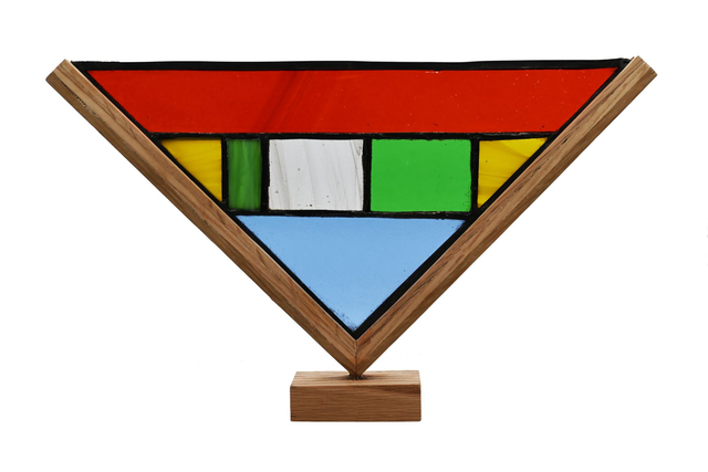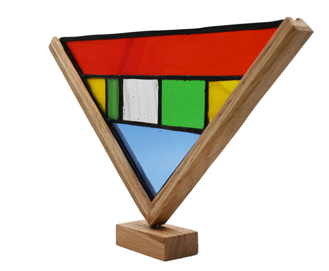 Vitrail technique Tiffany Dimensions : H 17,5 L 19,00 cm. composition verre, cuivre, plomb, chêne. Prix emballage et port via Mondial Relay inclus.
